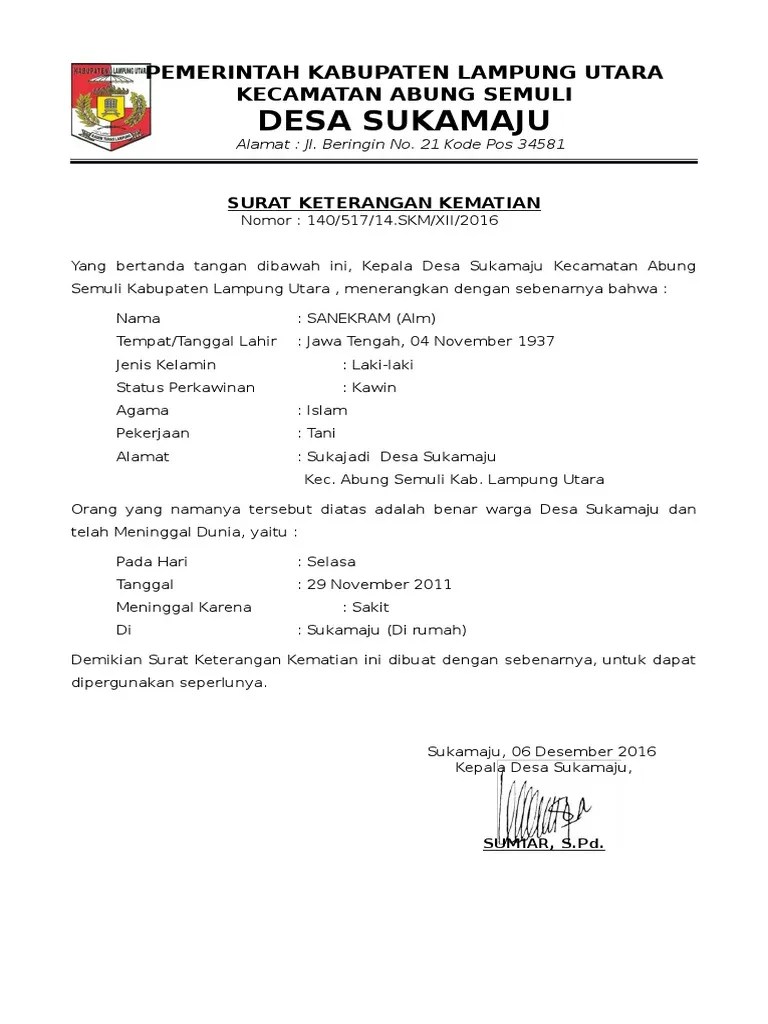 Ketika duka itu mulai pulih, ada dokumen yang perlu kamu urus nih, bela. A g a m a. Apalagi anda yang akan mengurus dokumen tersebut dengan pejabat daerah s. Melihat contoh surat kematian yang benar diperlukan bagi kamu yang hendak mengurus dokumen tersebut ke rt/rw, desa, hingga dukcapil. Apabila almarhum meninggal di rumah sakit maka dapat meminta surat keterangan dokter. Apabila kerabat anda meninggal di rumah sakit, maka anda harus menyiapkan surat keterangan kematian dari dokter, surat pengantar dari rt/rw setempat yang . Telah meninggal dunia pada : Demikian surat keterangan kematian ini kami buat untuk dapat dipergunakan sebagaimana mestinya. Selain akta lahir, orang meninggal pun juga . Setiap penduduk yang dengan sengaja memalsukan surat dan/atau dokumen.